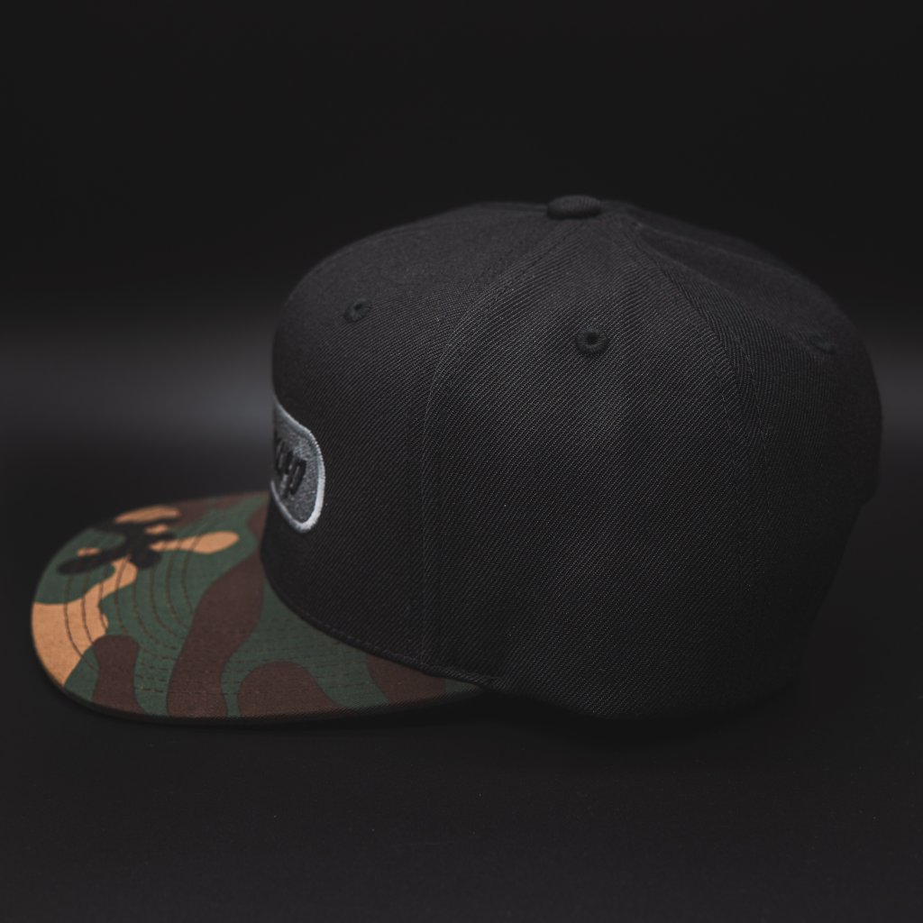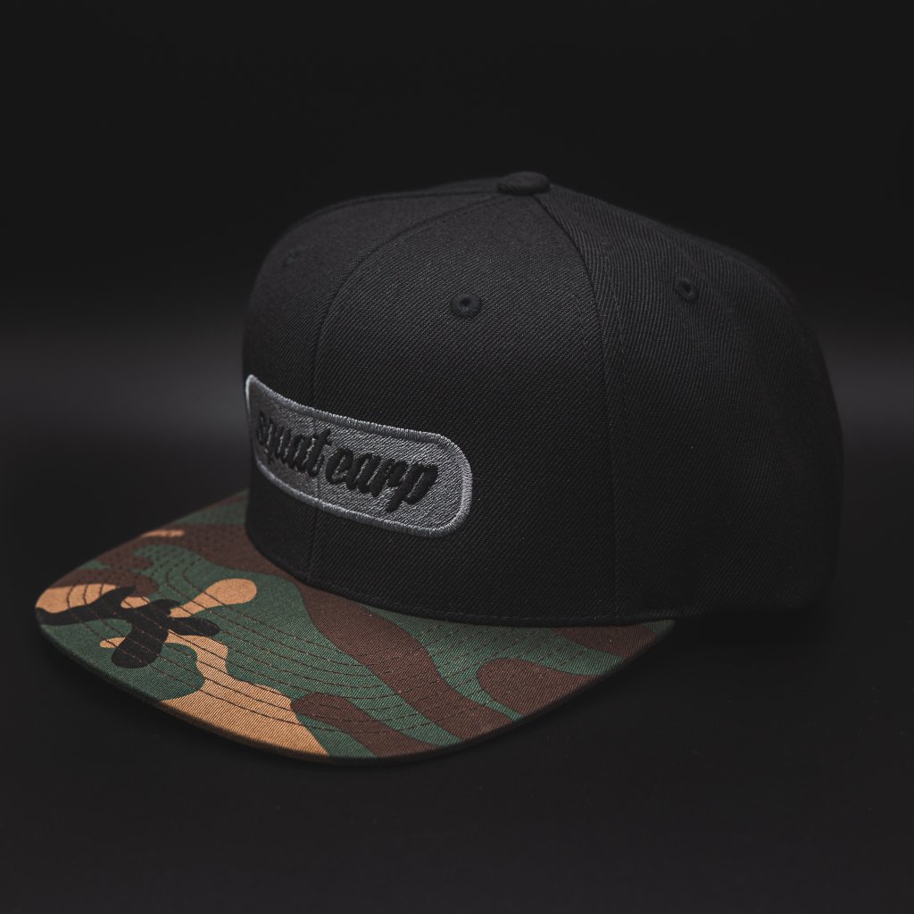 Stylová kšiltovka - typ snapback v černé barvě s camo kšiltem a logem Squat Carp.